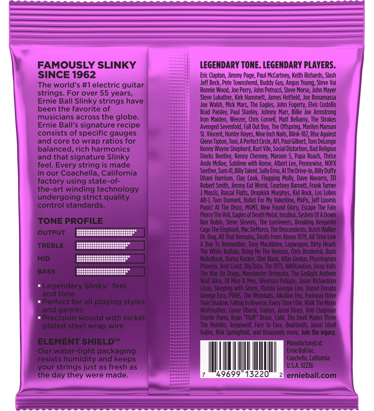 DE essentiële snaren. Aangenomen door Eric Clapton, Jimmy Page, Slash, Angus Young en een tal van andere legendes! Deze snaren zijn vervaardigd in overeenstemming met de zeer strikte specificaties van Ernie Ball die optimale prestaties garanderen. De zeshoekige kern is omwonden door een nikkel snaar voor een langere levensduur.