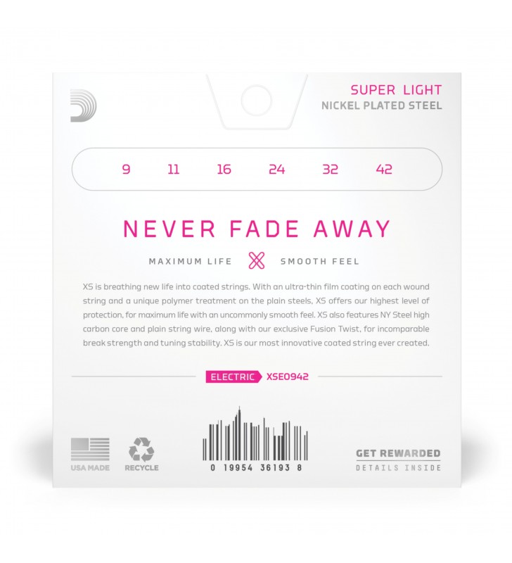 XS Nickel-gecoate elektrische gitaarsnaren bieden de langste levensduur van alle D'Addario elektrische gitaarsnaren. Dankzij onze baanbrekende XS-coating bereiken deze premium elektrische snaren een maximale levensduur en een soepele, snelle feel zonder hun uitstekende klank te dempen. Gemaakt met een NY Steel-kern, opnieuw geformuleerde vernikkelde stalen wikkeldraad en Fusion Twist-technologie, bieden XS Nickel-snaren superieure sterkte en stemvastheid, plus rijkere boventonen, meer helderheid en een opmerkelijke definitie bij elke sweep, slide en bend. Deze 9-42 Super Light-set is gemakkelijk te buigen en zeer flexibel.