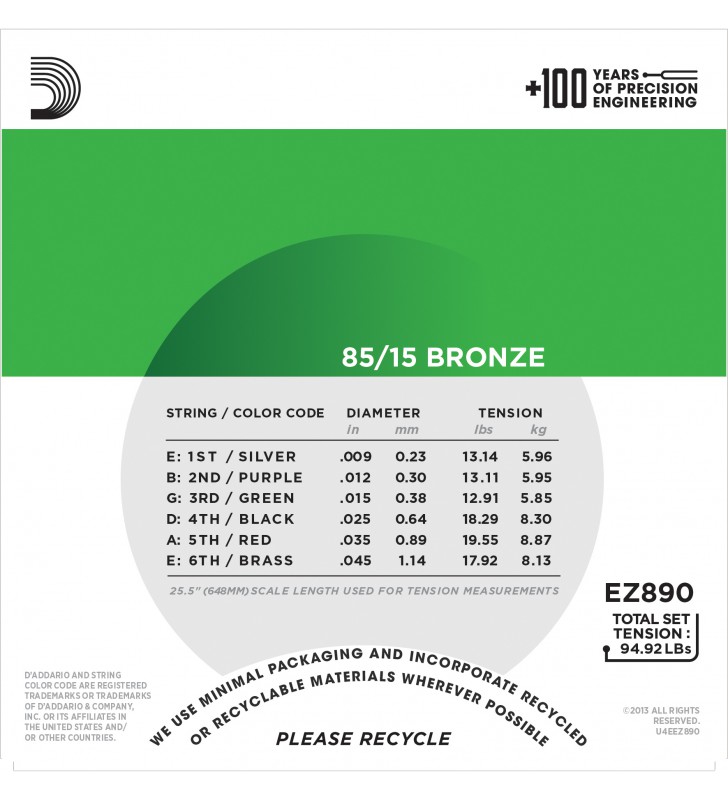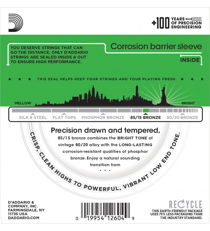 85/15 Bronze combineert het briljante van 80/20 Bronze met de langere levensduur van Phosphor Bronze. De 85/15 bronzen wikkeldraad is nauwkeurig gewonden op een zorgvuldig getrokken, hexagonale RVS kern, wat resulteert in een langdurige, helder klinkende toon met uitstekende intonatie.
