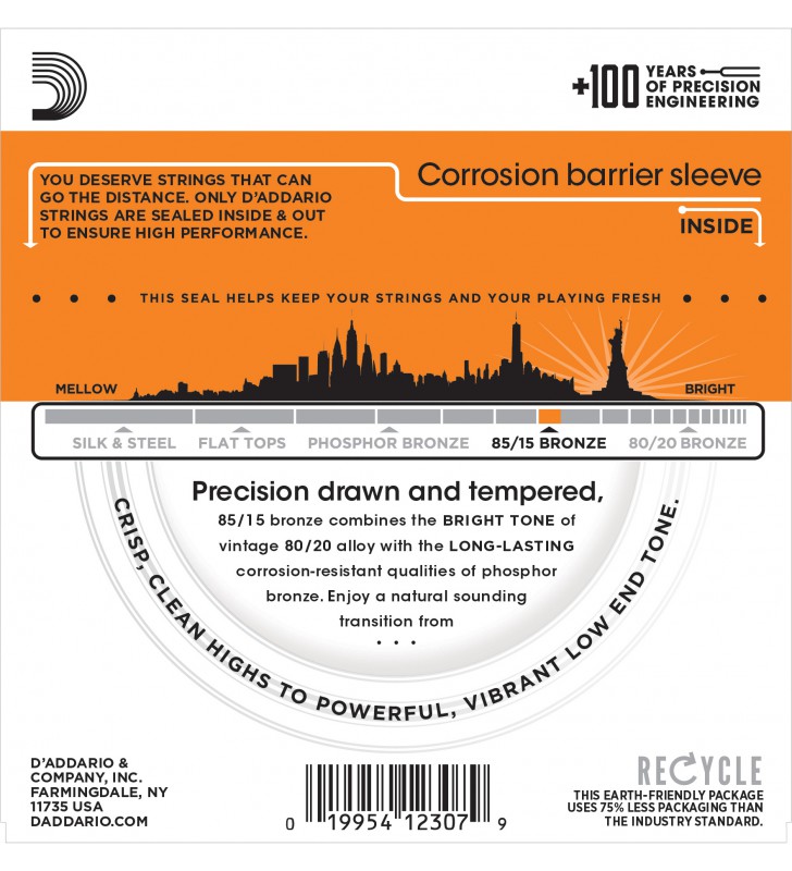 85/15 Bronze combineert het briljante van 80/20 Bronze met de langere levensduur van Phosphor Bronze. De 85/15 bronzen wikkeldraad is nauwkeurig gewonden op een zorgvuldig getrokken, hexagonale RVS kern, wat resulteert in een langdurige, helder klinkende toon met uitstekende intonatie.
