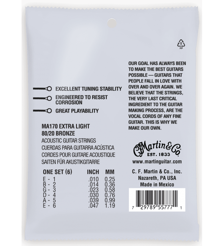 Martin Authentic Acoustic snaren zijn ontworpen om te voldoen aan de behoeften van gitaristen. Uitgaande van een zeer sterke kern voegde Martin een laag tin toe aan de 6 snaren voor een verhoogde weerstand tegen corrosie. Ze werden vervolgens voorzien van een winding van hoge kwaliteit die een consistente klank geeft voor een uitermate lange periode.