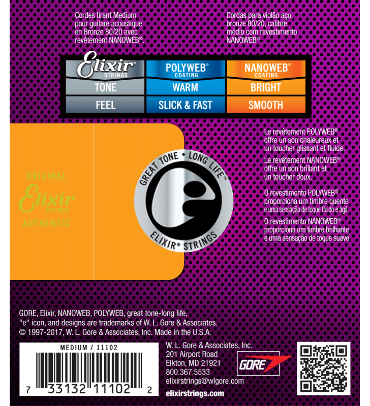 Elixir is het enige merk waar de hele snaar beschermd wordt door een ultradunne coating, waardoor vuil, vet, huidcellen niet tussen de windingen kunnen komen, en zweet de snaren niet aantast. Hierdoor blijft Elixir zo lang fantastisch klinken!!