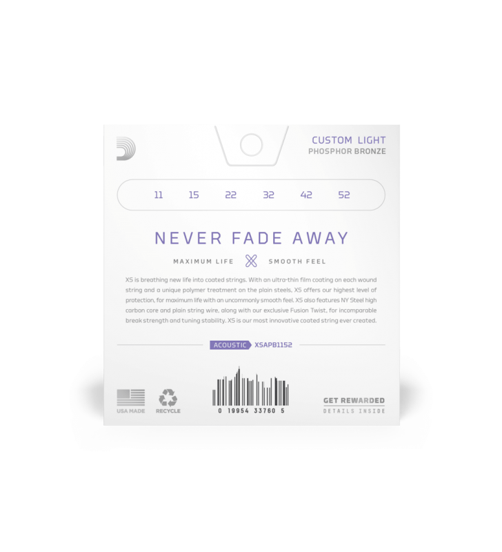 D'Addario XS Acoustic Phosphor Bronze-snaren combineren onze meest populaire akoestische legering met onze meest geavanceerde snaarcoatingtechnologie, wat resulteert in een heldere klank, een soepel gevoel en superieure tuningstabiliteit - allemaal met de langst mogelijke snaarlevensduur. Met zijn ultradunne filmcoating op elke omwonden snaar en een unieke polymeerbehandeling op de onomwonden snaren, biedt XS ons hoogste niveau van bescherming voor een maximale levensduur. XS heeft ook een kern van NY Steel met een hoog koolstofgehalte, en onze exclusieve Fusion Twist, voor een onvergelijkbare breeksterkte en stemstabiliteit. XS is de meest innovatieve gecoate snaar die we ooit hebben gemaakt. DEZE SET BLIJFT KLINKEN!!