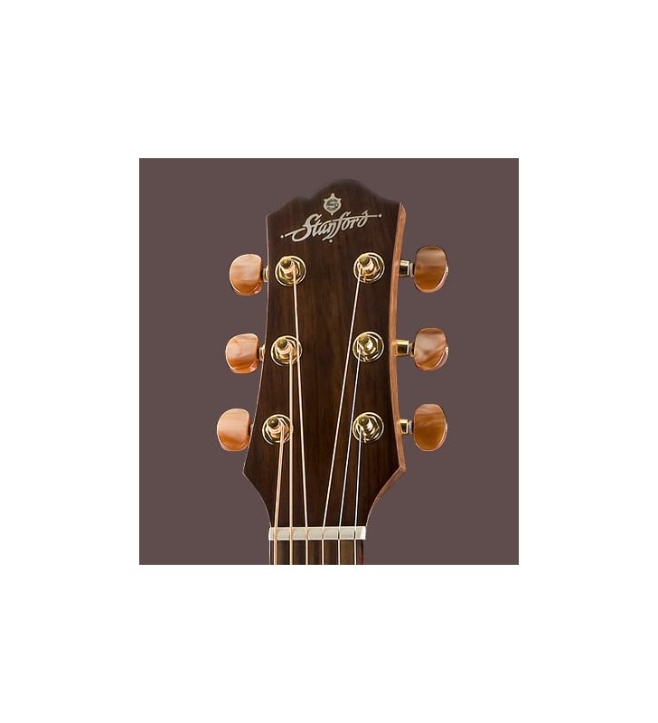 Dreadnought met een massief sparren bovenblad en gelamineerde zij- en achterkant van mahonie. Alle instrumenten uit de 46-serie spelen zeer comfortabel met hun zadelbreedte van 46 mm. Een speciaal ontworpen bracing maakt de gitaar extreem responsief met een breed scala aan klanken en adembenemende dynamiek. De Venetiaanse cutaway maakt het spelen in elk register een plezier. Elke Stanford 46 wordt geleverd met een high-end Nautilus Posydon pickup.