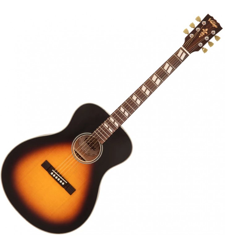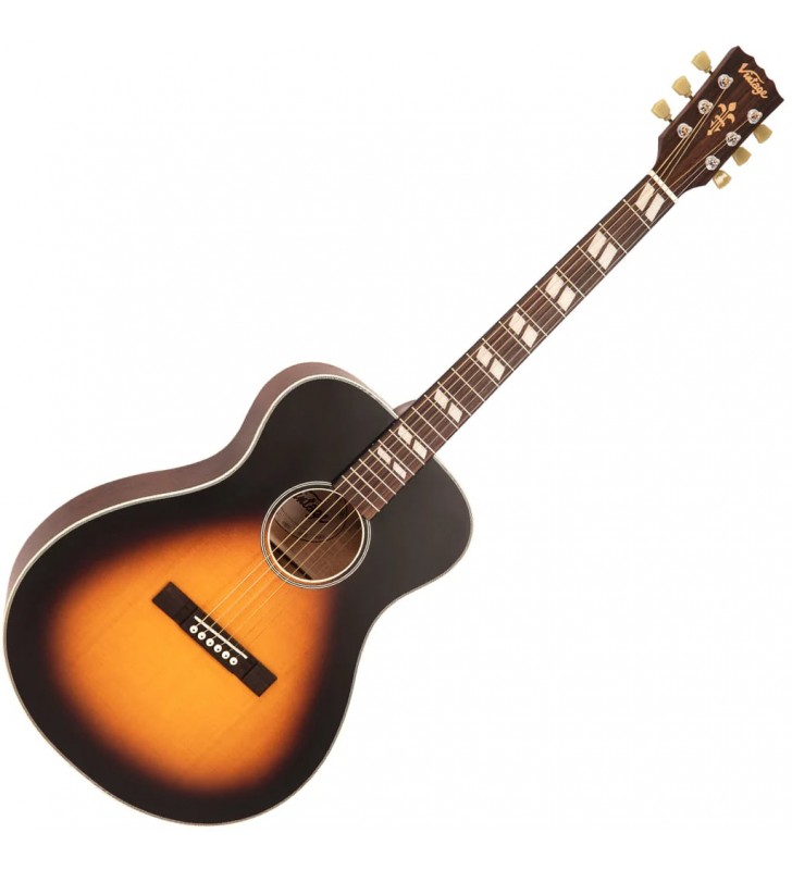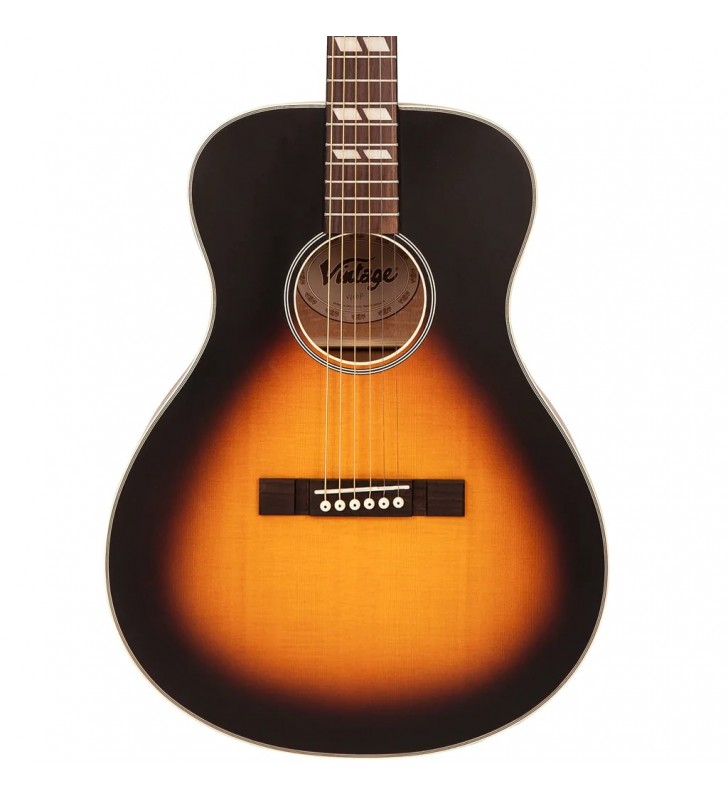 Met een prachtige satijnen toplaag over een prachtige Vintage Sunburst-afwerking, straalt de Vintage Historic Series Folk akoestische gitaar klasse uit in elke zin van het woord.