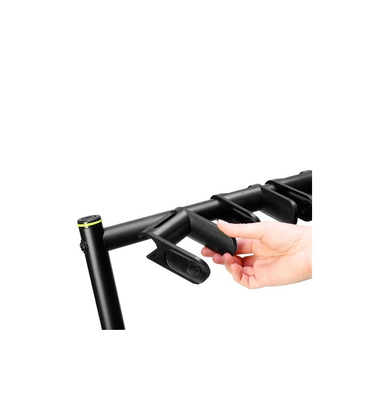 Beschikt over flexibele draagarmen voor verschillende gitaarmodellen, bedekt met niet-beschadigend rubber om het instrument te beschermen.