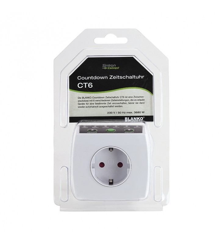 De BLANKO CT6 is een gebruiksvriendelijke, praktische en energiebesparende timer waarmee aangesloten apparaten kunnen worden ingeschakeld voordat ze automatisch worden ingeschakeld na een bepaalde, instelbare tijdsduur (15/30 minuten of 1/2/4 en 6 uur) weer uitschakelen.