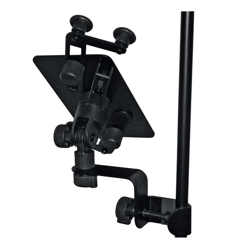Een slanke maar stevige stalen beugel (meegeleverd) maakt het mogelijk om de tablethouder zijwaarts te monteren op de verticale paal van elke microfoon- of bladmuziekstandaard met een diameter variërend van 14 tot 30 mm.