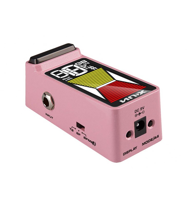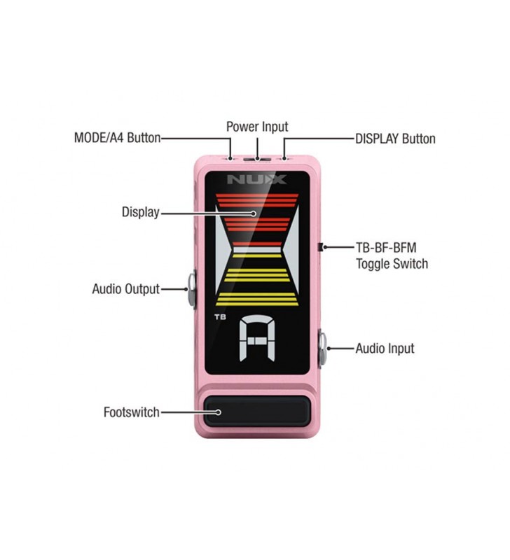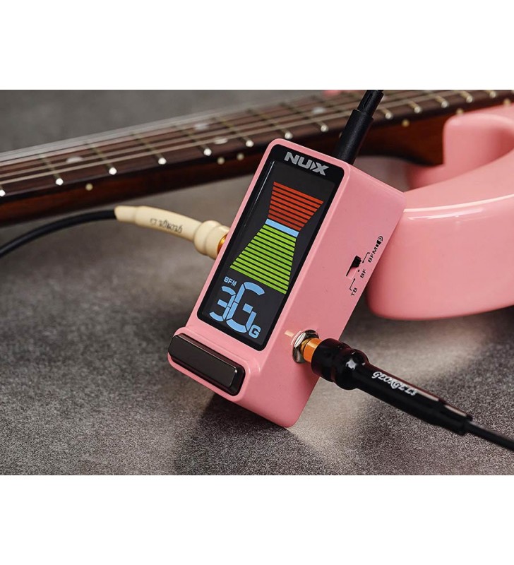 De NUX Flow Tune Mini in het roze is een compact en krachtig stempedaal voor gitaar en basgitaar. Het grote high-definition kleurendisplay blijft onder alle omstandigheden duidelijk zichtbaar, waardoor je snel en nauwkeurig stemt, zowel in de studio als op het podium. De tuner biedt meerdere modes, waaronder chromatisch, gitaar (standaard of gecompenseerd) en bas, plus verschillende visuele weergavestanden zoals strobe en pijlindicatoren.