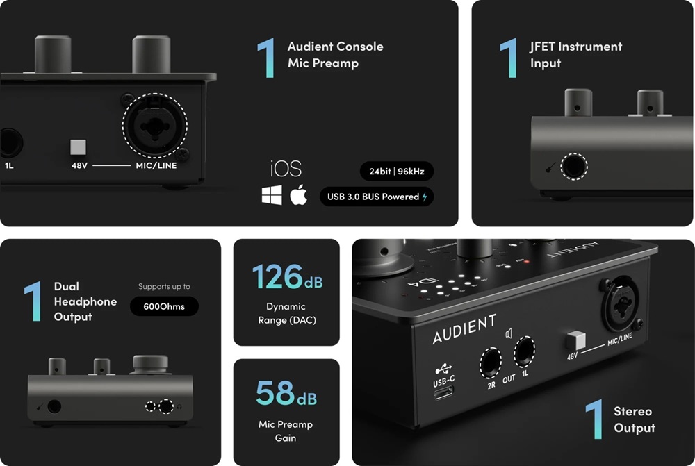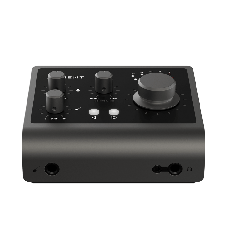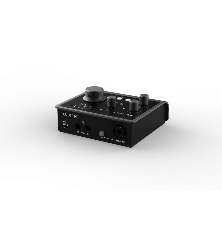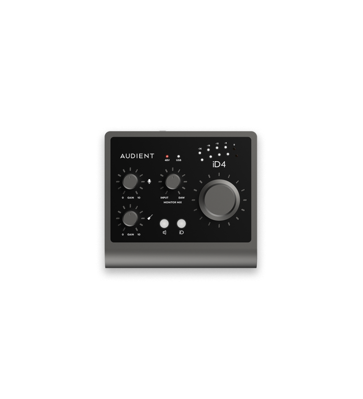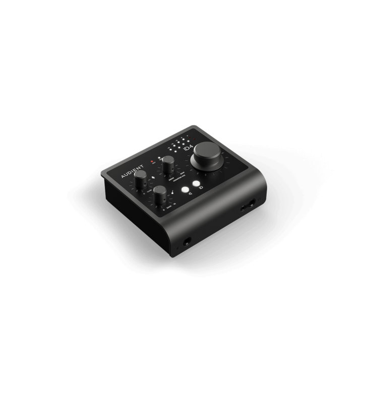 Hoewel hij klein is, biedt de iD4 een groot aantal functies – met een volledig analoge Audient Console microfoonvoorversterker, geavanceerde 32-bit AD/DA-converters, één JFET-instrumentuitgang en twee hoofdtelefoonuitgangen, allemaal in een formaat van 13 x 12 cm.