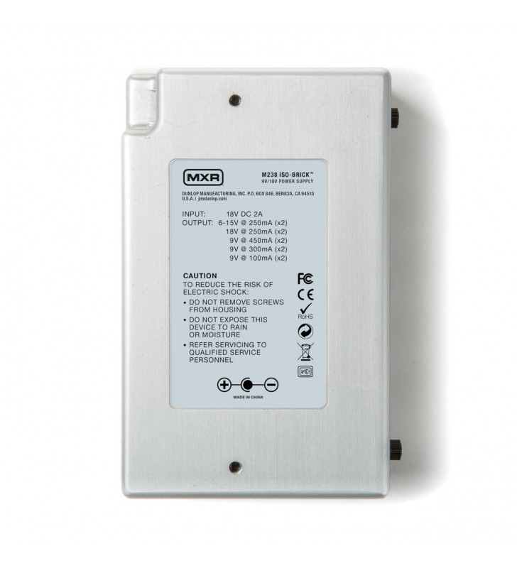 Elk van de 10 uitgangen van de Iso-Brick Power Supply is volledig geïsoleerd, waardoor gig-ending aardlusruis wordt geëlimineerd. Of het nu analoog of digitaal, positieve of negatieve aarde is, met deze powerbox bent u verzekerd. Het MXR-team heeft deze 10 uitgangen opgesplitst om tegemoet te komen aan een verscheidenheid aan spannings- en stroomvereisten: twee 9V-uitgangen bij 100mA, twee 9V-uitgangen bij 300mA, twee 9V-uitgangen bij 450mA, twee 18V-uitgangen bij 250mA en twee variabele uitgangen instelbaar van 6V tot 15V bij 250mA. De twee variabele uitgangen kunnen worden gebruikt om spanning "sag" na te bootsen, het lege batterij-effect waarnaar veel vintage tonechasers zoeken.