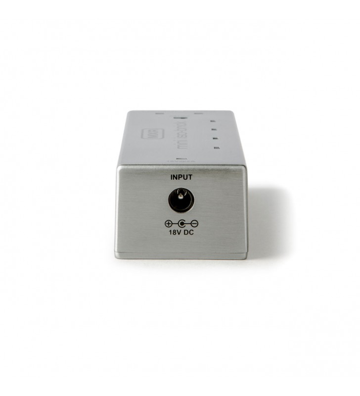 Laten we het eerst hebben over de uitgangen. De Mini Iso-Brick-voeding heeft vijf, en elk is volledig geïsoleerd om onaangename, optredende aardlusruis te elimineren. Vier van de uitgangen leveren 9 volt bij 300mA, terwijl een vijfde kan worden ingesteld om ofwel 9 volt of 18 volt bij 800mA te leveren, afhankelijk van uw behoeften. Met een royale hoeveelheid stroom op de tap en de mogelijkheid om zowel negatieve als positieve aarding te verwerken, zijn deze uitgangen geschikt voor bijna elk pedaal, analoog of digitaal.