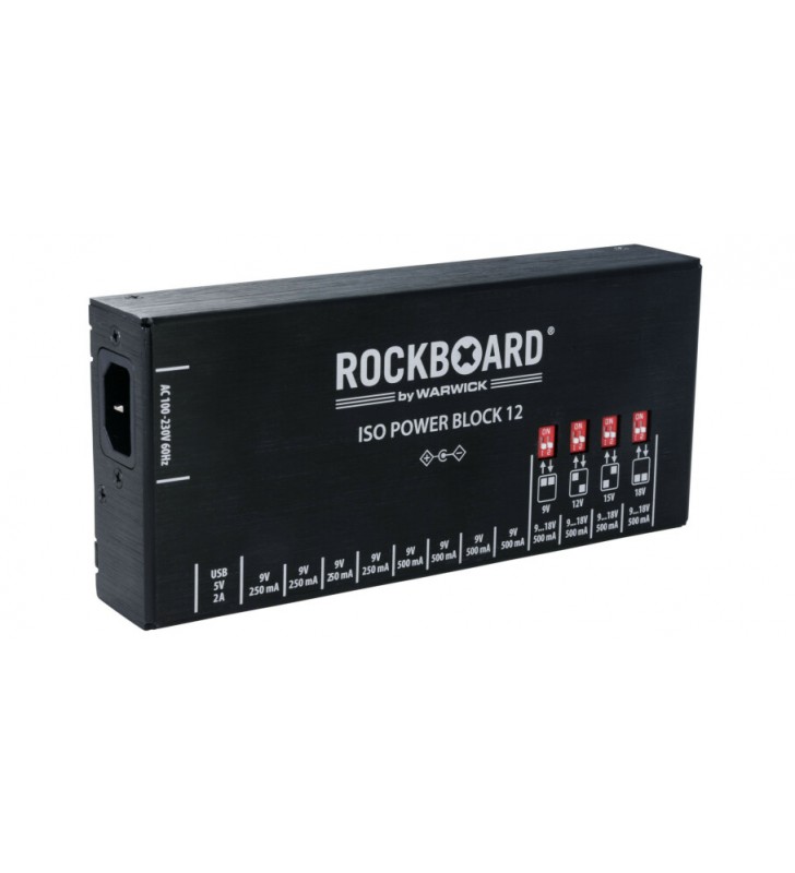 Het RockBoard ISO Power Block 12 IEC is een multi-voeding voor effectpedalen met 6 geïsoleerde transformatoren en sterk gefilterde voedingssleuven en een enkele 5V USB-uitgang. De multi-voeding is ontworpen om tot 12 effectpedalen tegelijk te voeden zonder ruis. De geavanceerde filtertechnologie in de DC power slots voorkomt hoogfrequente ruis. Gebouwd met individuele slot kortsluitbeveiliging, zijn aangesloten effectpedalen beschermd in geval van kortsluiting. Met een speciale LED voor elk voedingsslot die aangeeft dat het slot correct werkt, kunt u eventuele problemen snel opsporen zonder dat de overige pedalen stroom verliezen.